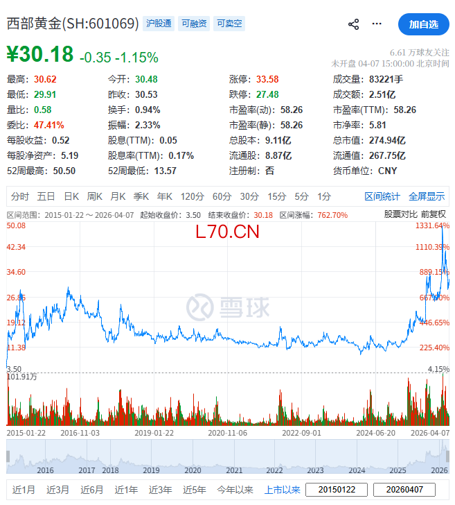 西部黄金(601069.SH)于2015年1月22日在A股上市,截至周二(4月7日)收市,其总市值约274.94亿元人民币。