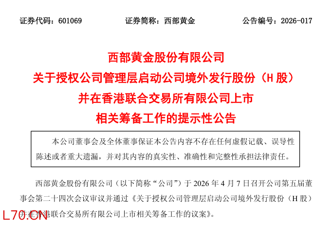 来自新疆乌鲁木齐的A股上市公司西部黄金(601069.SH)于周二(4月7日)发布公告称,公司第五届董事会第24次会议审议并通过《关于授权公司管理层启动公司境外发行股份(H股) 并在香港联合交易所有限公司上市相关筹备工作的议案》。 为进一步推进公司国际化战略,满足公司业务发展的需要,增强公司治理水平和核心竞争力,公司拟在境外发行股份(H股)并在香港联合交易所有限公司挂牌上市,公司董事会授权公司管理层启动本次H股上市的前期筹备工作。公司计划与相关中介机构就本次H股上市的具体推进工作进行商讨,关于本次H股上市的细节尚未确定。