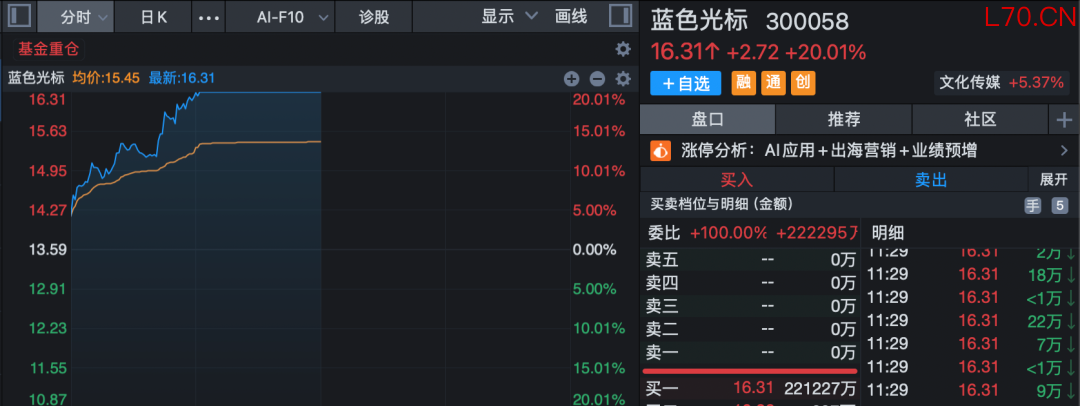 人工智能概念全线大涨,AI营销方向领涨,板块指数单边上扬逾7%,不到1小时成交超昨日全天成交。蓝色光标(300058)20%涨停,粤传媒开盘仅约1分钟垂直涨停,连续第2日封板,引力传媒、利欧股份等逾10股涨停或涨超10%。