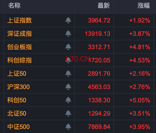 今日早盘,A股大幅高开高走,创业板指、科创综指均大涨超4%,深证成指、北证50也涨超3%,上证指数收复3900点。超5000只个股上涨,成交呈快速放大趋势。