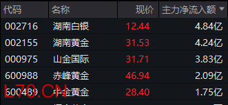 Wind实时监测数据显示,截至午间收盘,贵金属板块获得逾20亿元主力资金净流入,湖南黄金、山金国际、中金黄金等均获得超1亿元净流入。