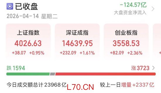 4月14日,A股高开高走,午后出现下跌,但尾盘拉升,沪指重回4000点;三市交易量能增至2.4万亿元,呈现量价齐升态势;超3700只个股收红,电子、军工、有色等板块领涨。