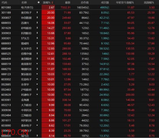 9只电子股涨停,奥尼电子、协创数据“20cm”涨停,迅捷兴、矽电股份、科翔股份、锴威特、长光华芯、佰维存储等个股涨幅超过10%,宏昌电子、京泉华、沪电股份、利通电子等个股也涨停。