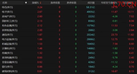 综合板块涨幅超过3%,电子、房地产、国防军工、有色金属领涨,农林牧渔、通信、电力设备、机械设备、计算机也表现不错。