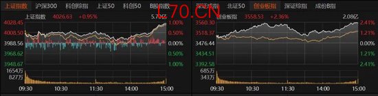 沪指收涨0.95%报4026.63点,创业板指收涨2.36%报3558.53点,深证成指收涨1.61%。上证50收涨0.85%,沪深300、北证50涨约1%,科创50收涨2.17%。