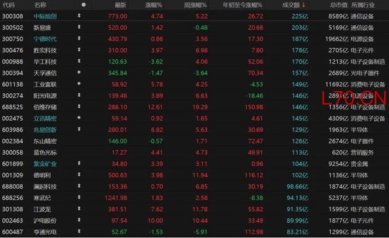 市场赚钱效应较好,共计3723只个股收涨,涨停股71只;1594只个股收跌,跌停股10只。15只个股日成交额超过100亿元,中际旭创收涨4.74%报773元/股,新易盛收涨1.42%报520元/股,胜宏科技涨近4%,工业富联涨约6%。
