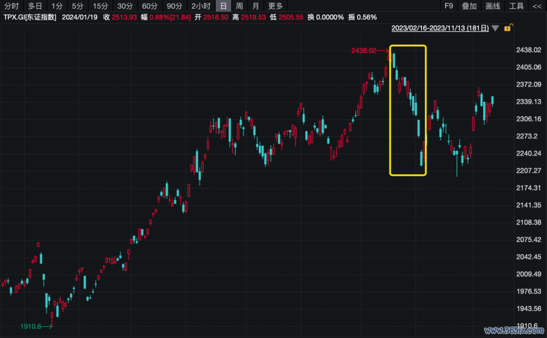 上一次该指标突破“超买”门槛是在2023年9月,随后东证指数一路狂泻9%。