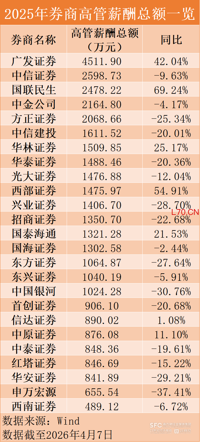 从2025年高管薪酬总额来看,广发证券以4511.90万元高居榜首;排在其后的中信证券、国联民生、中金公司、方正证券则进入2000万元阵营,高管薪酬总额分别为2598.73万元、2478.22万元、2164.80万元、2068.66万元。