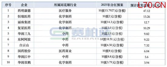恒瑞医药、丽珠集团、复星医药位列第二、三、四名。三家化药企业预计派发总额均超10亿元,分别为13.26亿元(10派2元含税)、12.7亿元(10派14.3元含税)和10.29亿元(10派3.9元含税)。