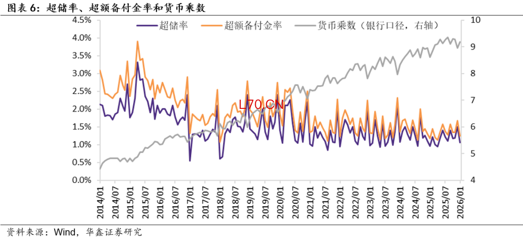 我们再来看金融机构的资产端,一般而言,在流动性资产充裕背景下的去杠杆称之为主动去杠杆,对应流动性边际松弛;在流动性资产紧张背景下的去杠杆称之为被动去杠杆,对应流动性边际收紧。对于银行而言,我们认为,观察流动性资产充裕与否的关键指标是超额备付金率,其与货币乘数基本保持负向相关关系(除降准形成的干扰之外)。2026年1月银行超额备付金率录得1.2%,前值1.7%;2026年1月货币乘数录得8.68,前值8.45。综合来看,2026年1月,我们衡量货币政策的三大数量型指标——基础货币余额增速、金融机构负债增速、超额备付金率——两降一升(金融机构负债增速上升),我们认为,2月虽然货币政策难言松弛,但非银金融机构带动资金面有所改善、高点大约形成在2月9日附近,春节前后资金面有明显的边际收敛和松弛波动。3月资金面大概率边际收敛。结合其他数据来看,2月货币政策边际上有所松弛。