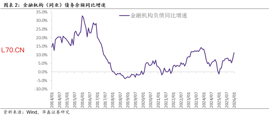 对于非银金融机构而言,我们认为,观察流动性资产充裕与否的关键指标是其存款余额的同比增速。我们在这里选取计入M2的非银金融机构存款,数据显示,2026年1月该数据同比增长34.2%,大幅高于前值23.4%,结合负债数据,我们认为2026年1月非银金融机构流动性边际上或有明显松弛,并带动资金面整体改善。