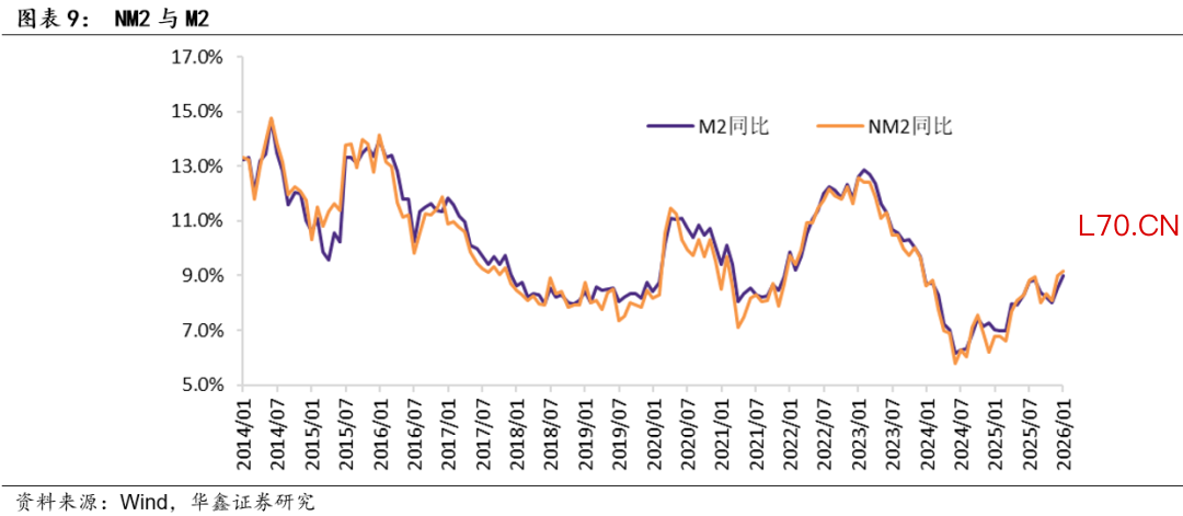 此外,根据标准M2的定义,即四部门(家庭、政府、金融机构、非金融企业)持有的可动用的现金和存款,我们构建了新的广义货币供给指标(NM2),数据显示,其与M2的走势相似,但2017年以来绝对水平更低,反映了金融去杠杆力度更大的影响。不过,2018年7-12月,上述情况略有逆转,对应实体部门转而成为去杠杆的重点。2019年以来,政府逐步带动实体部门增加杠杆,货币整体中性,抑制金融杠杆。在2020年3-5月,上述情况发生逆转,金融机构加杠杆的速度超过实体。在2020年6月以来政策的调控下,NM2持续表现偏弱,2022年2-4月,与针对疫情的放松有关,NM2同比增速连续高于M2。2022年5月,上述情况出现逆转,NM2同比增速稳定在10.9%,与前值持平,低于同期M2同比增速(11.1%),这也对应着货币政策在5月出现边际收敛。2022年7月之后,NM2同比增速在2024年2月首度超过M2同比增速,但3-8月快速回落至低于M2的水平,9月NM2同比增速回升至7.1%,高于同期M2同比增速(6.8%),10月NM2同比增速继续上升至7.5%(仍略高于同期M2同比增速,连续两个月NM2同比增速高于M2,这预示着未来货币政策边际宽松空间已微乎其微。2024年11月之后,NM2同比增速持续低于同期M2同比增速的情况在2025年5月出现变化,5-8月NM2同比增速持续高于同期M2。2025年9月NM2同比增速大幅下降至8.0%,低于同期M2;但10-12月则连续高于同期M2,2026年1月NM2同比增速上升至9.1%,继续高于同期M2。我们相信按照金融让利实体的思路,NM2同比增速后续大概率还是会低于M2同比增速,这也意味着货币政策在目前情况下进一步松弛的空间已经非常有限。