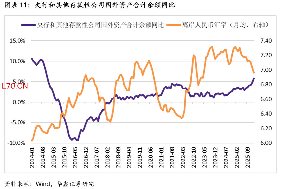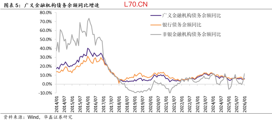 我们对第一部分中金融机构的债务口径进行拓展,截止2026年1月末,广义金融机构债务余额168.6万亿,同比增长6.5%,低于前值4.9%。其中,银行债务余额138.0万亿,同比增长5.3%,前值5.4%。分结构来看,各个科目余额同比增速涨跌互现;对央行负债同比下降至18.0%,前值同比增长31.7%,这和央行资产端对其他存款性公司债权的表现一致。非银金融机构债务余额30.7万亿,同比增长11.9%,前值同比增长3.0%,银行资产端对金融机构债权余额增速亦转而上升。
