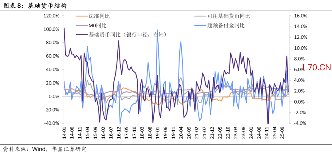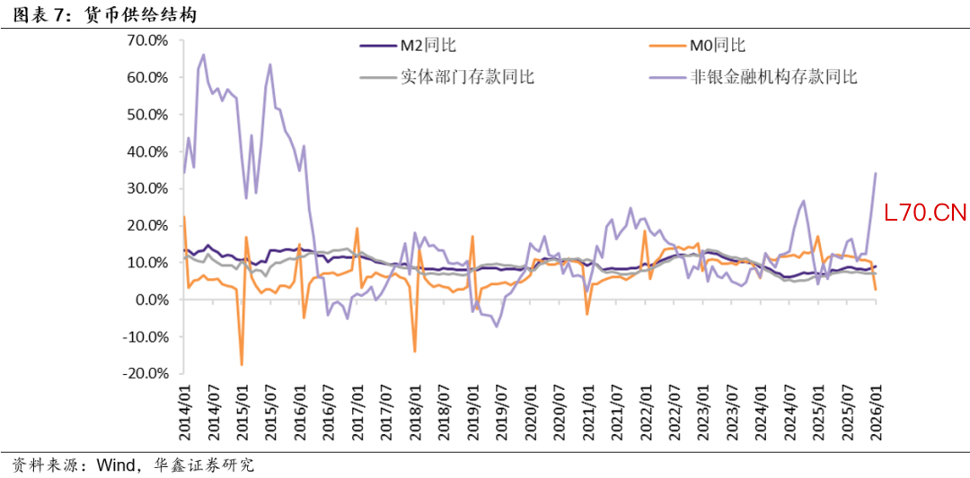 从基础货币供给的角度来看,2026年1月末其余额同比增长1.9%,前值同比增长8.5%。