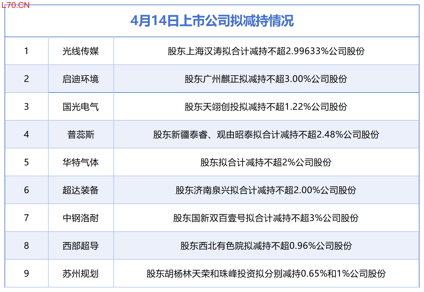 4月14日增减持汇总:光线传媒等9股拟减持,当日无A股增持(表)